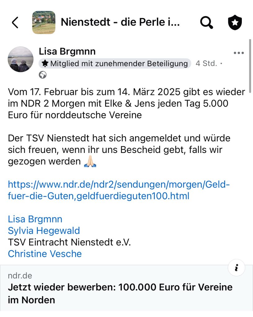 Unser Sportverein hat sich bei der NDR2 Aktion „Geld für die Guten“ beworben.