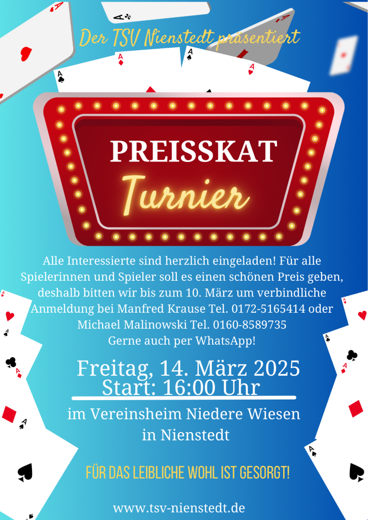Alle interessierten Spielerinnen, Spieler und Zuschauer sind herzlich zum 1. Preisskat Turnier in diesem Jahr eingeladen!